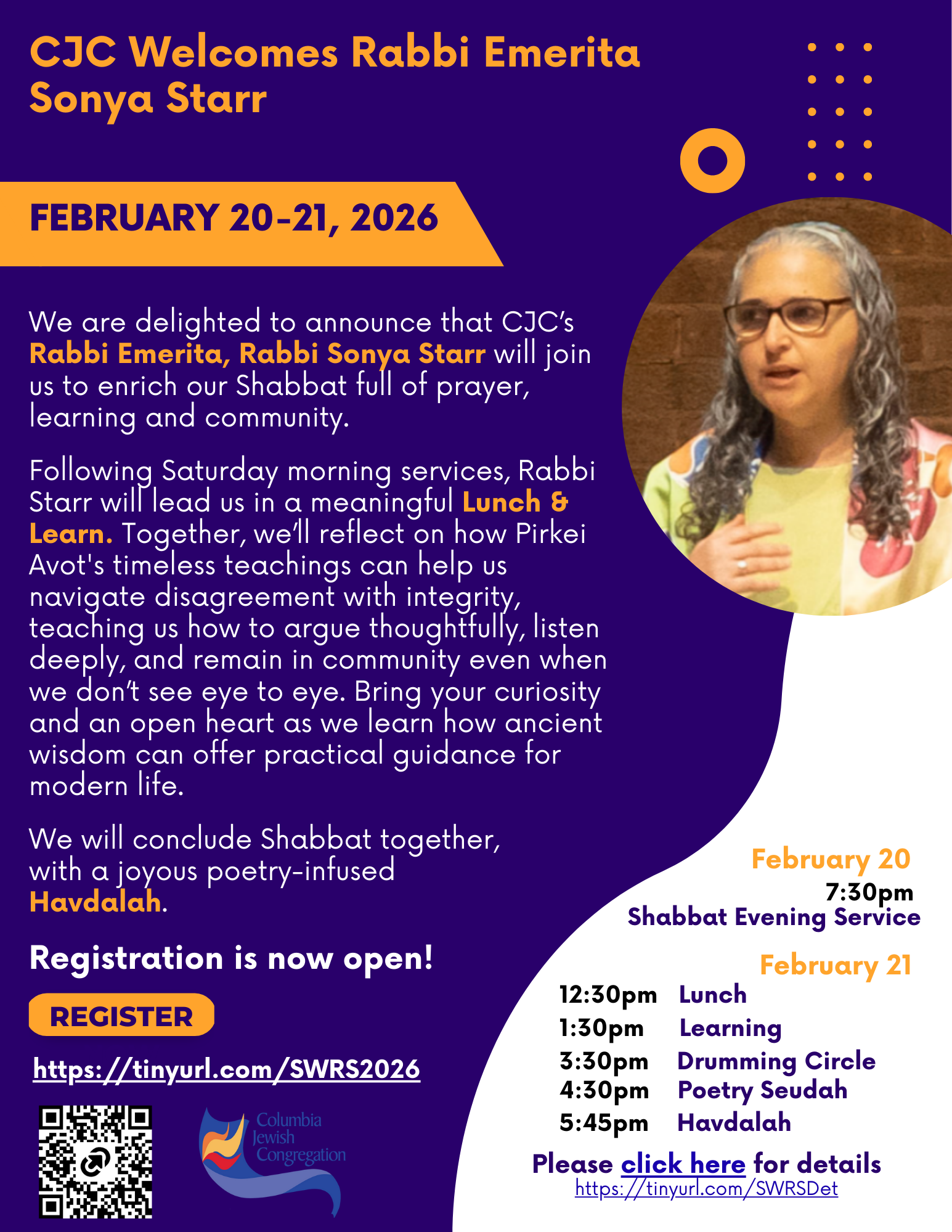 Please note: If you have already registered and received a Friday evening unique link, no need to register again. If you have misplaced your link, please email robin@columbiajewish.org